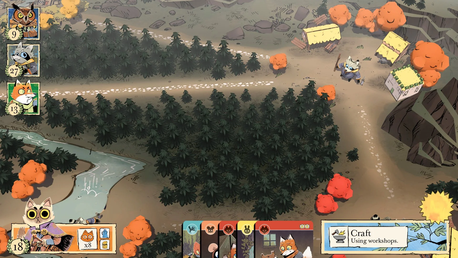 Root has an asymmetrical design where each faction plays with different rules. Each faction required a different set of action buttons, inventory, and stats. I took inspiration from RTS games like Starcraft when designing the UI for Root. The top-down camera angle and bottom-anchored “control panel” worked exceptionally well for this project. The primary goal for the UI design was to distill the complex mechanics of the game into a clean design that felt approachable. The mocks below were early explorations of the general layout of the HUD.